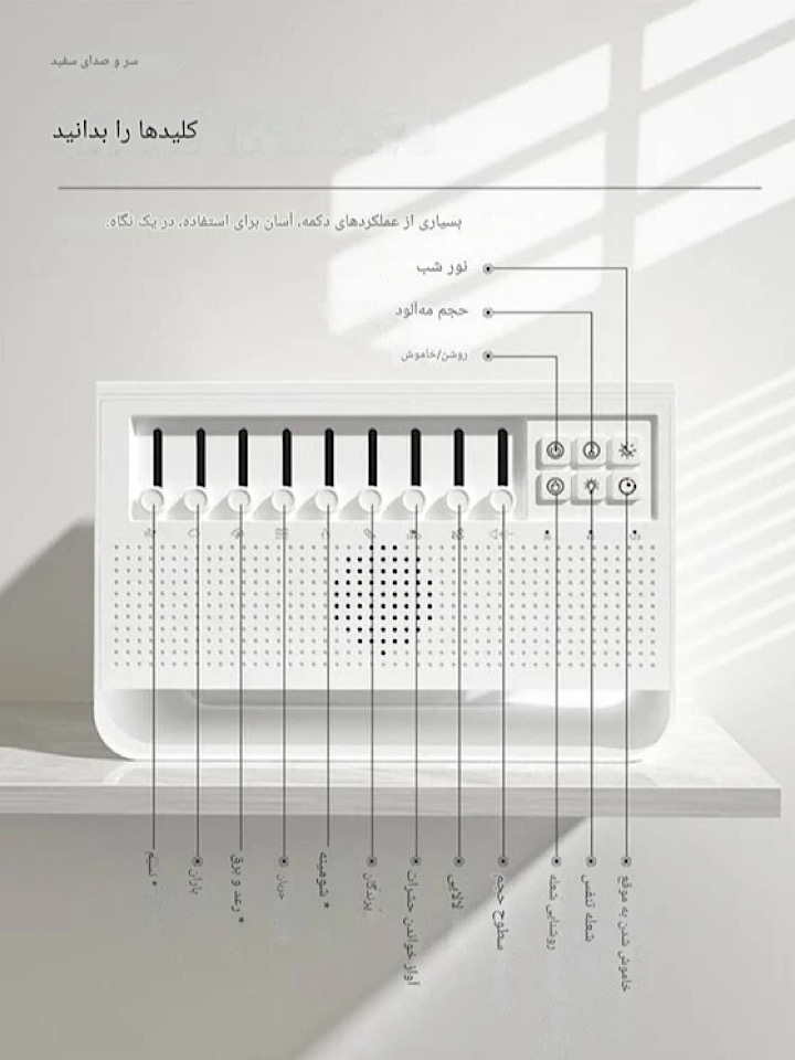 درون این دستگاه، ۸ حالت صدای نویز سفید الهامگرفته از طبیعت تعبیه شده که به کاهش استرس، بهبود خواب، و تمرکز بیشتر کمک میکند. این صداها شامل صدای باران، جنگل، موج دریا، و باد ملایم هستند.☘💜